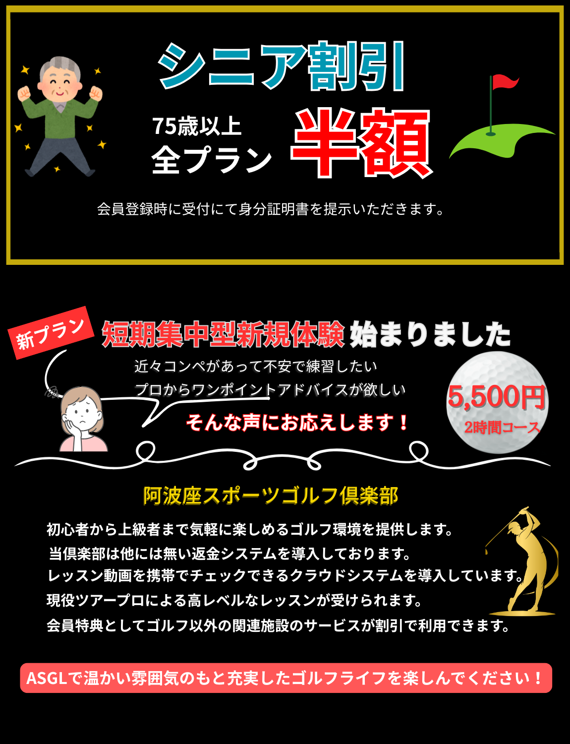 阿波座スポーツゴルフ倶楽部は一般ゴルファーにとどまらず全てのゴルファーの上達のお手伝いを致します。特にジュニアゴルファーの育成には力を入れております。またレッスンプロの方に最新設備のインドア練習場をリーズナブルな価格でレンタルルームとしてご提供致します。