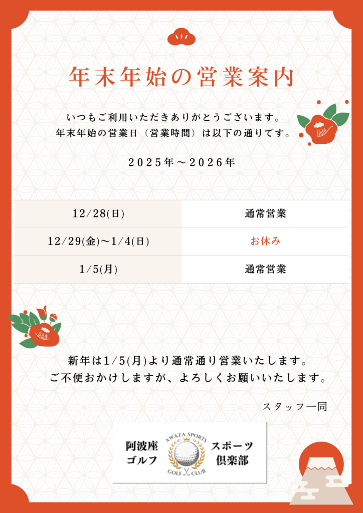 さて、年末年始の休業日につきまして、下記のとおり休業日とさせていただきます。